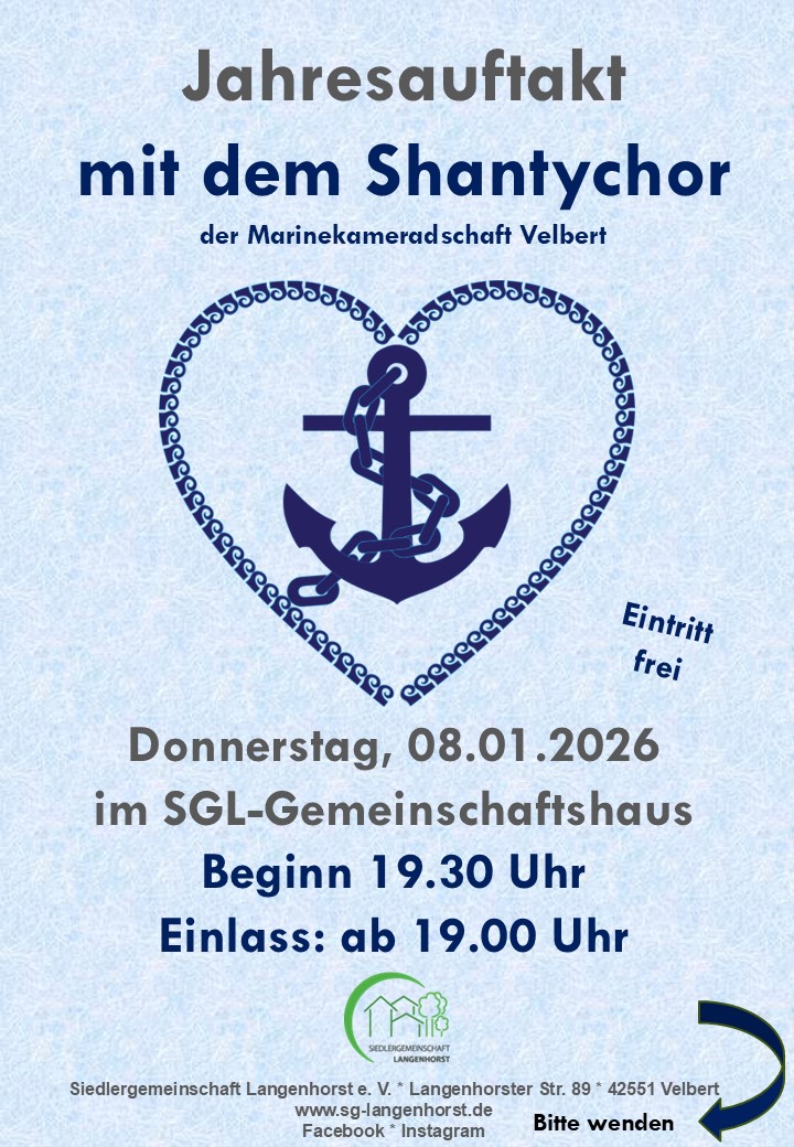 « Alle Veranstaltungen Jahresauftakt mit dem Shanty Chor 8. Januar 2026,19:30 - 21:00 « SGL-Kreativtreff Zum Kalender hinzufügen Google Kalender iCalendar Outlook 365 Outlook Live Details Datum: 8. Januar 2026 Zeit: 19:30 - 21:00 Veranstalter Siedlergemeinschaft Langenhorst e.V. Veranstaltungsort Siedlergemeinschaft Langenhorst e.V. Langenhorster Straße 89 Velbert, 42551 Deutschland Google Karte anzeigen