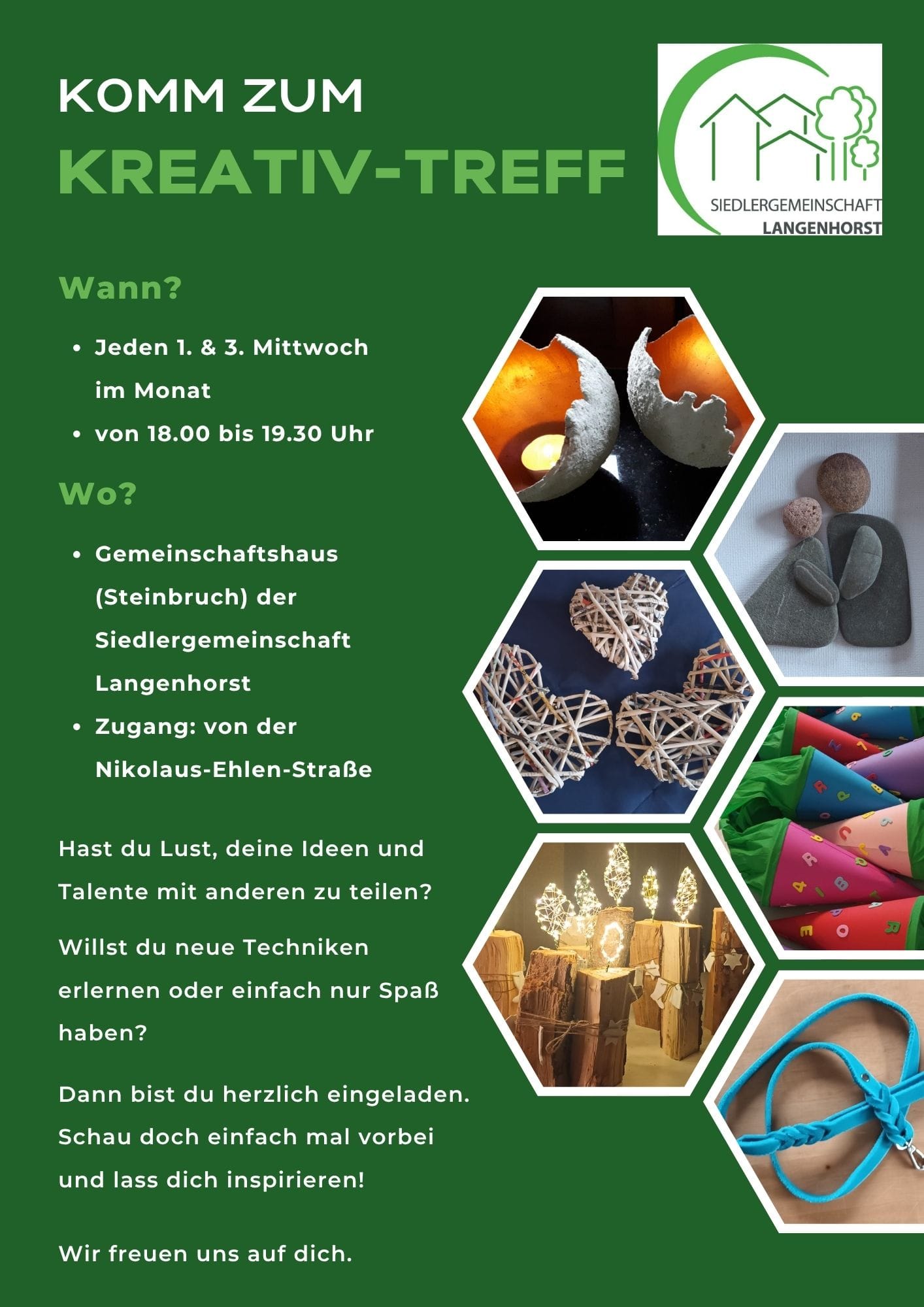 Jeden 1. und 3. Mittwoch im Monat treffen wir uns von 18.00 bis 19.30 Uhr im "Steinbruch", dem Raum im Erdgeschoss unseres im Gemeinschaftshauses (Eingang von der Nikolaus-Ehlen-Straße). Kontakt Anke Hegemann: a.hegemann@sg-langenhorst.de |